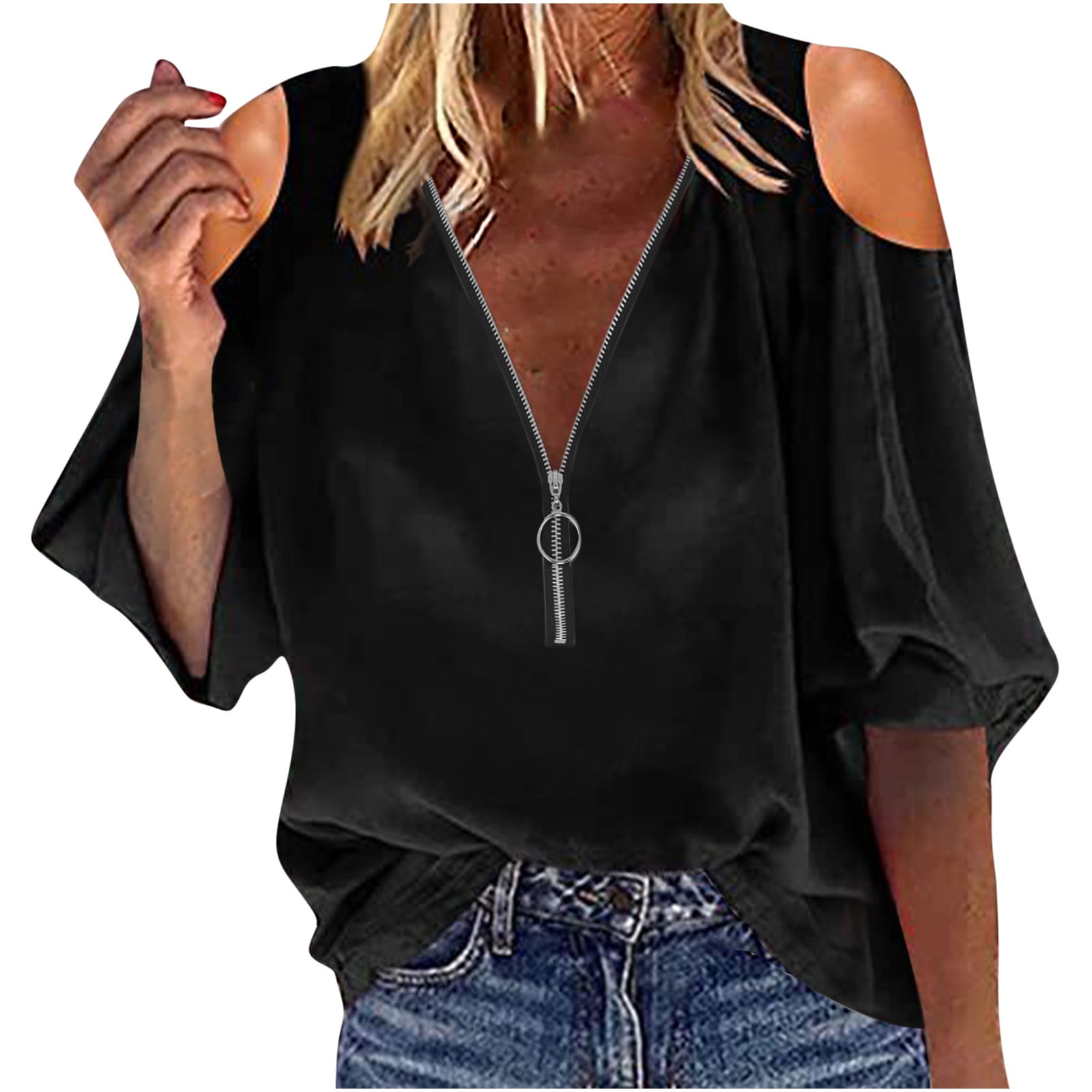 Trendy Womens Fall Fashion Long Sleeve T Shirts Loose Tunic Western Tops For Ladies 1 4 Zip V Neck Pullover Plus Size Tops Solid Color Sweatshirts Black M Walmart Com